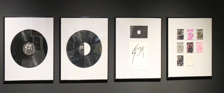 El sistema del logo de Soda Stereo aplicado tarjetas y vinilos.