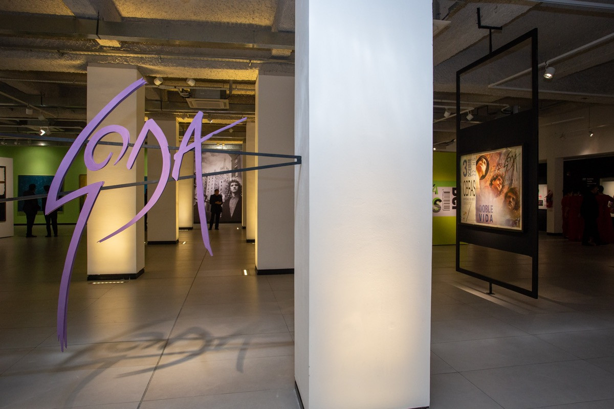 1. El logo lila de Soda Stereo, calado en madera y colgado como escultura, más una gigantografía de la fotografía de tapa de Doble Vida.